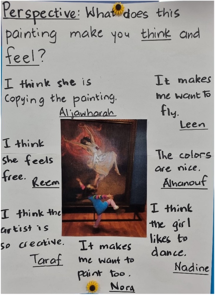 Gallery walks became a favorite activity as students turned into mini art critics, carefully studying images to figure out what artists and photographers were trying to communicate. They eagerly shared their own perspectives and emotions, even diving into conversations about AI-generated images – deciding they can be fascinating, weird, and wonderful, but also something we need to view thoughtfully. Our learners traveled the globe (without leaving the classroom!) to see how different cultures use visual representations to tell stories, preserve history, and express community life.