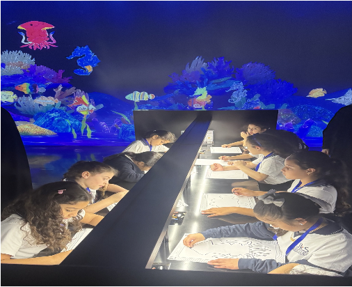 Our Grade 3 students recently enjoyed an exciting field trip to TeamLab in Jeddah. The visit connected beautifully to our Unit of Inquiry about creativity and how people express ideas. As soon as we entered the exhibition, students were amazed by the moving lights, interactive walls, and colorful digital art that changed when they touched it.